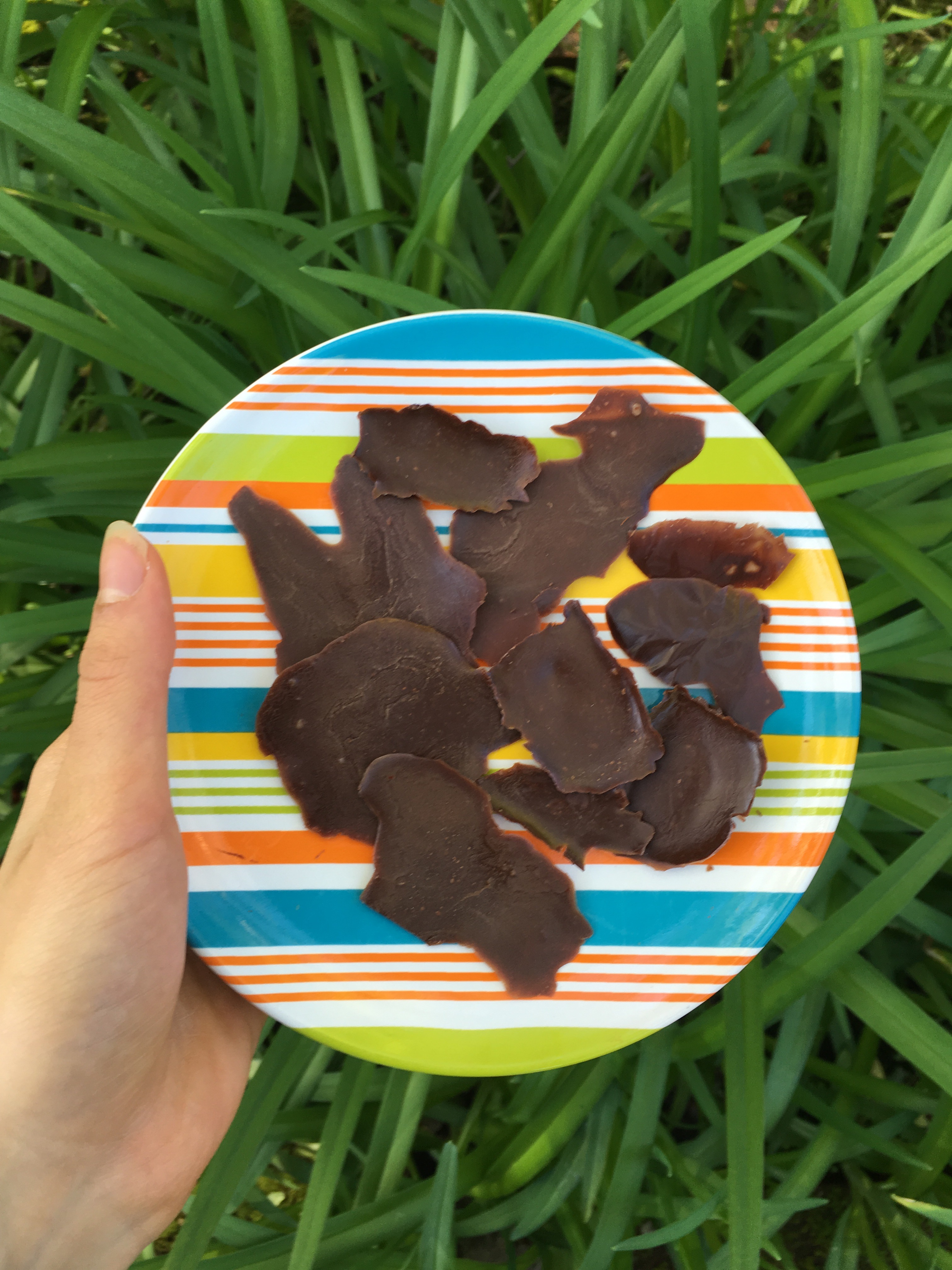 Melt the coconut oil in the microwave (it should take around 20 seconds), and stir in the cocoa powder. Then simply spoon a bit onto wax paper or aluminum foil. It will spread out a bit, so you can just make little drops with your spoon and they’ll even out into chip form by themselves. If you like, you can find some ice-cube molds and very thinly line the bottom of those with your mixture! Go crazy! It’s choco-chip-crazy!